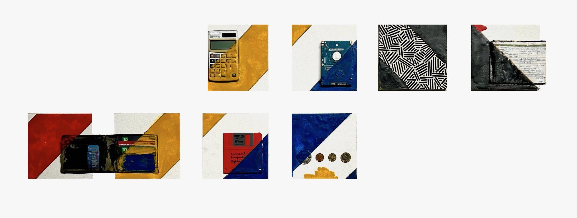 Personal Relic #6 (Memory Banks) 2025, archived objects with encaustic treatments, 14” x 47” installed