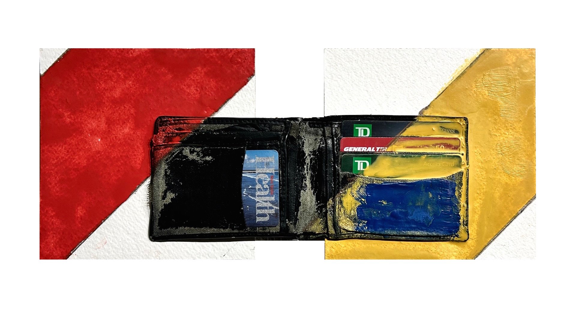 Dykhuis’ personal relics are a rag-tag collection of things that represent his modest life thus far. They are overlaid with painted stripes that conflate graphic components of Medieval crests and coats of arms with ‘flat’ modernist, minimalistic painting – each power tropes in their own mutual ways.